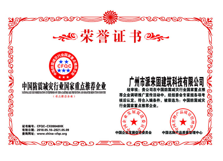中國防震減災行業(yè)國家重點推薦企業(yè)榮譽證書